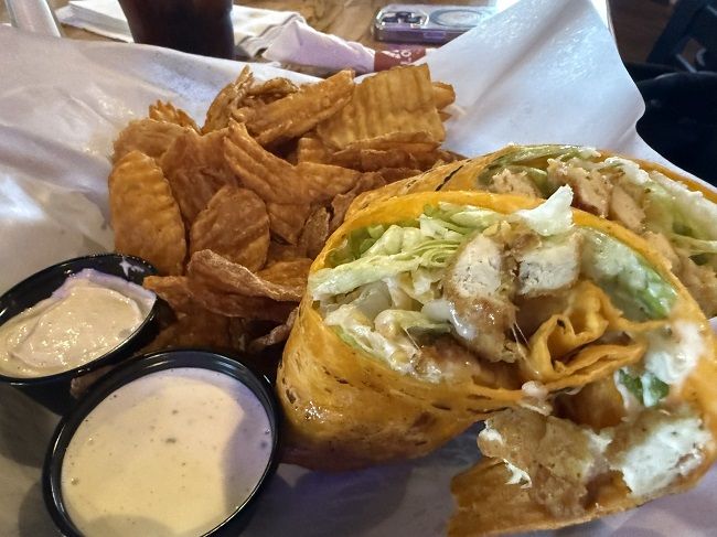 J did the Chicken Ranch Wrap. This sandwich is a jalapeno cheddar tortilla filled with fried chicken tenders, lettuce, tomato, onion, shredded cheese, and ranch. You can also get this one “Buffalo style” but J’s not a Buffalo person. The size of the wrap was pretty large and there was a good size portion of chicken. She also got the chips and French Onion dip as her side .