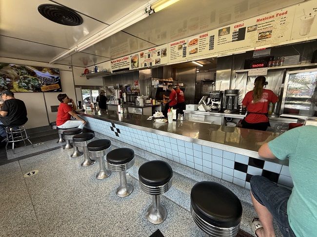 The interior of Angie’s matches the exterior. The small restaurant is set up as a classic 50’s diner. It’s waitress service with short black padded stools bolted to the floor at a lunch counter looking in to the kitchen. The menu, which is mostly burgers with some chicken sandwiches and some Mexican options, hangs above the counter.
