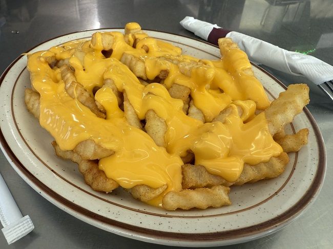 The fries actually came out first. Not long after I had ordered the waitress brought out a plate filled with crinkle cut fries covered in a thick cheese sauce. There was also an option for chili cheese fries, which I probably should have done, but I was happy with these. Fortunately, the waitress also brought me a fork because these fries were covered in cheese. I would have made a mess trying to pick these up with my fingers. The cheese fries are pretty simple. It’s all prepackaged stuff, but it’s good and it’s a good sized portion. It’s about what I expect from a diner like this.