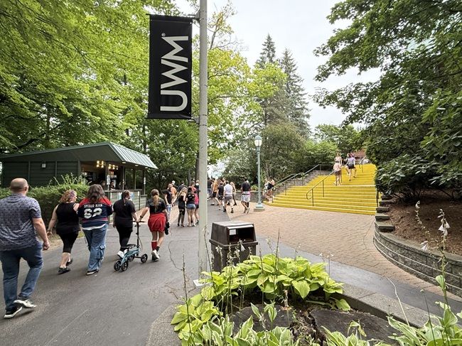 You enter in to the space behind the hill that makes up the lawn seating. There are wide, long walkways that run around to either side of the actual amphitheater.
