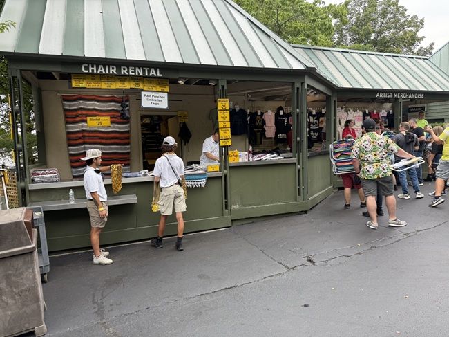 We walked around to the left side of the hill and found more concession stands including this one that rents out seats if you’re sitting on the lawn. They also sell blankets and I think they even had tarps. J tells me a story all the time about the time she went to see a show at The World Music Theatre and her dad told her to bring a tarp….best move they made that day as it rained through much of the show.