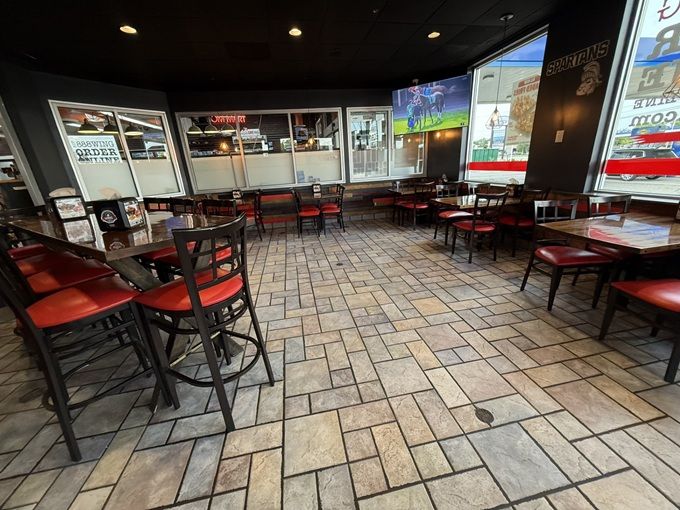 There’s a small dining room that is separated from the order area by a wall. The furniture has all been replaced with red and black chairs and tables to match Wing Snob’s color profile but the floor still very much gives off the McDonalds vibes.