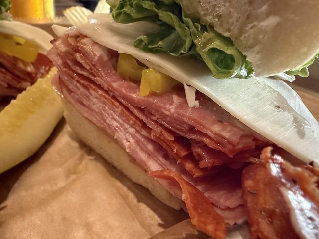 This sandwich is STACKED with meat. It’s funny to think about going to a bar and getting a sub sandwich but this sandwich is so good that you forget you’re at a bar. There is so much meat on the sandwich that it actually gets it’s height from the meat and not a mountain of veggies. There is one layer of lettuce on top and a layer of banana peppers plus a pretty healthy drizzling of Italian dressing. I’m a sucker for a sub sandwich with Italian dressing anyway but this thing was really tasty. I was kind of in a burger mood when I started my evening but one bit quickly turned that in to a sandwich mood.