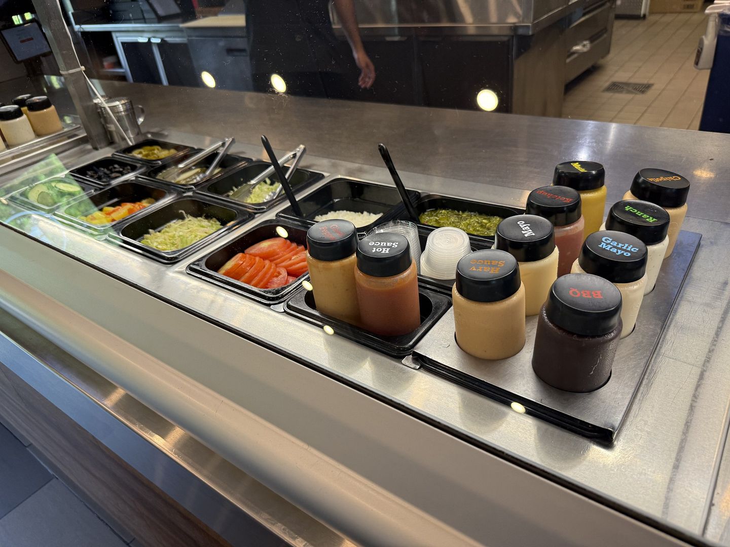 The reason for the sandwich type bar is because when you order, you’re just ordering a plain burger. Once it’s cooked, it’s handed to someone at this toppings bar and you pick your toppings right there. I actually really like this. You don’t have to guess at what’s on the burger when you order because there is nothing on it. I chose just to put lettuce and pickles on my burger. The guy putting it together asked if I wanted sauce. I considered the BBQ or hot sauce but decided to just skip it.