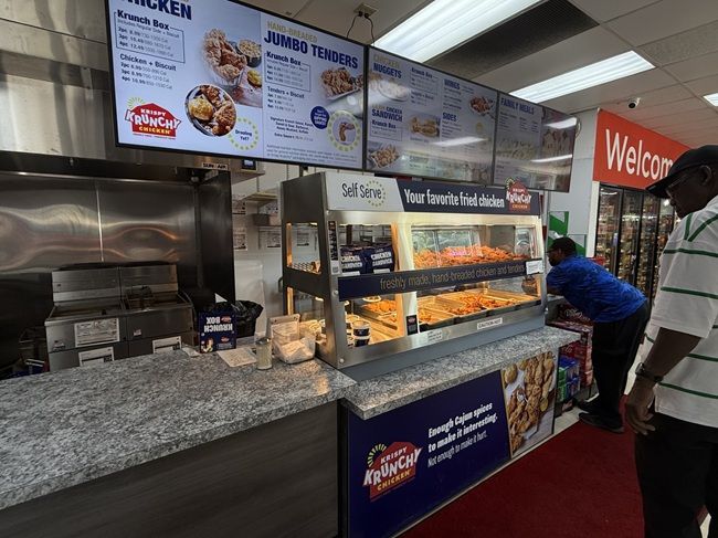 I’ve been in this gas station a few times but I forgot how big it is and how much extra space there is. The chicken counter is directly across from the door as you walk in. There’s a small kitchen set up behind the usual large chicken warmer filled with chicken pieces. The menu board hangs directly above the counter on several TV screens.
