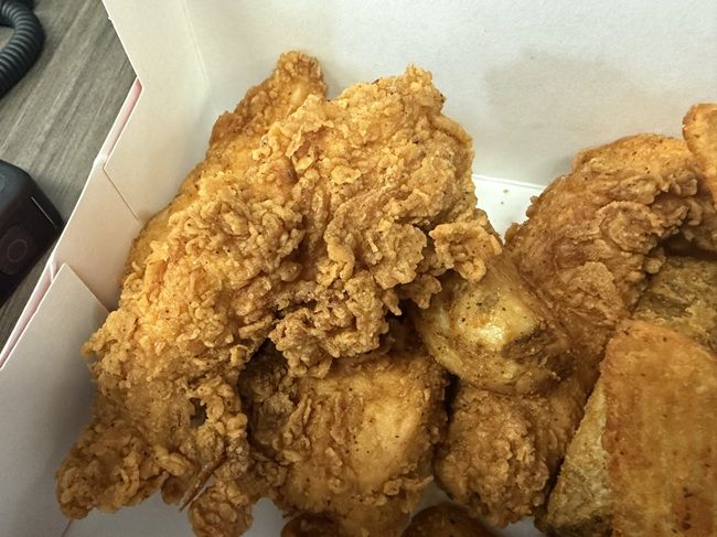 Eventually, I did get to the front of the line and put in an order for the four piece jumbo tenders Krunch Box. This comes with four tenders, a side, and a biscuit. I also grabbed a Pepsi from the cooler and headed to the main store cash register to pay while the chicken guy was boxing up my meal. The cost came to right around $15.