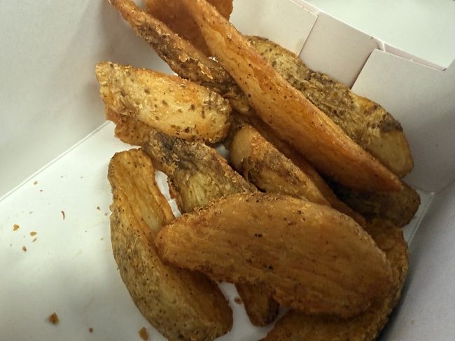The side I chose was the potato wedges. Again, when these are cooked right, they’re pretty tasty. There is a crispy out layer to the potatoes and a soft, pillowy interior. These were cooked right and had that texture combination. There is a little bit of spice to the wedges which give them a really great taste.