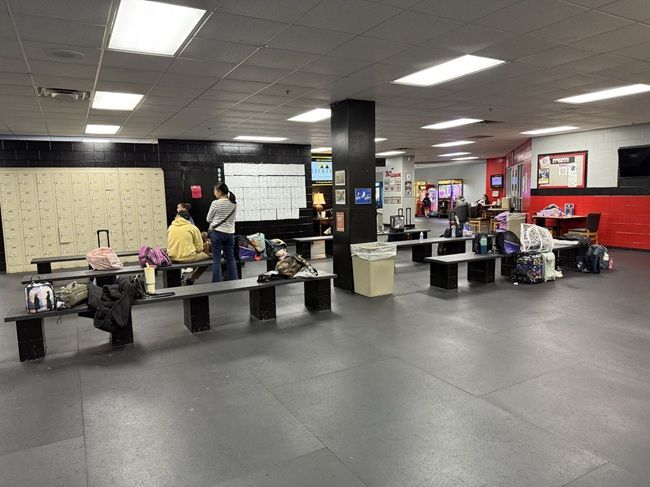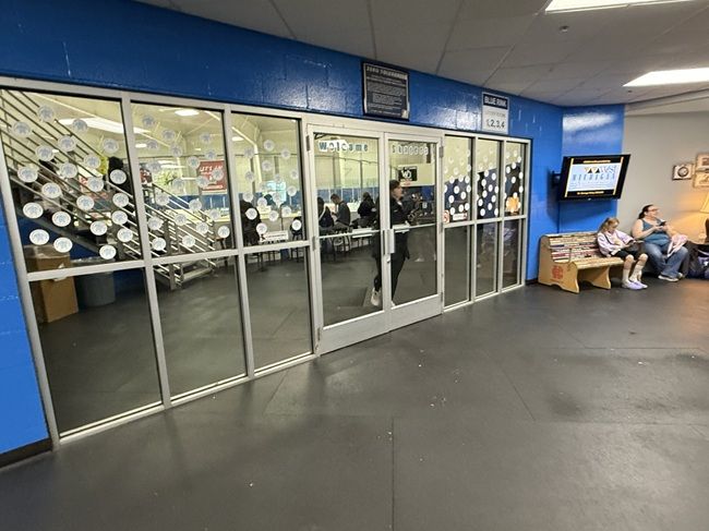 When you walk in to the facility, there is a pretty big lobby that greets you right away. There are offices on either side and you can see right away from the paint on the balcony how the building is divided into a red side and a blue side.