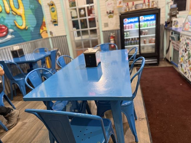 There is a little bit of seating inside with some blue painted metal tables and chairs. There’s more seating outside on a covered patio but it was dark and kind of cold so no one was using those spots. There was a pretty big group eating inside so I just found a spot at one of the tables that wasn’t being used and wait for my sandwich to come out.