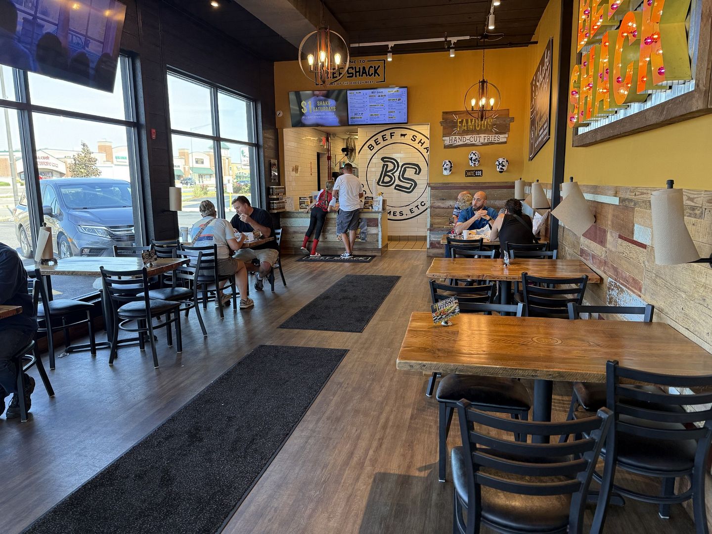 Beef Shack looks like a lot of counter service restaurants. When you walk in, there is a order counter at the back of the space. You need to walk through the dining room which consists of solid wood tables on either side of the aisle and a large light up sign with the stores name hanging on the wall opposite the floor to ceiling windows that look back on to West Main Street.