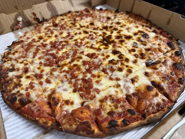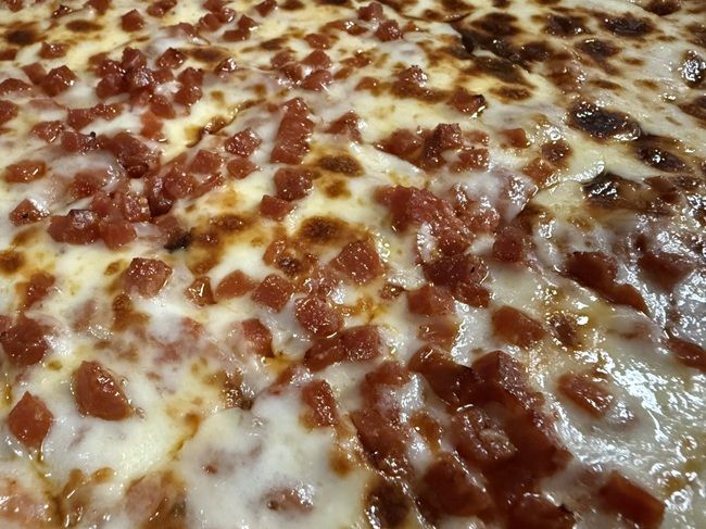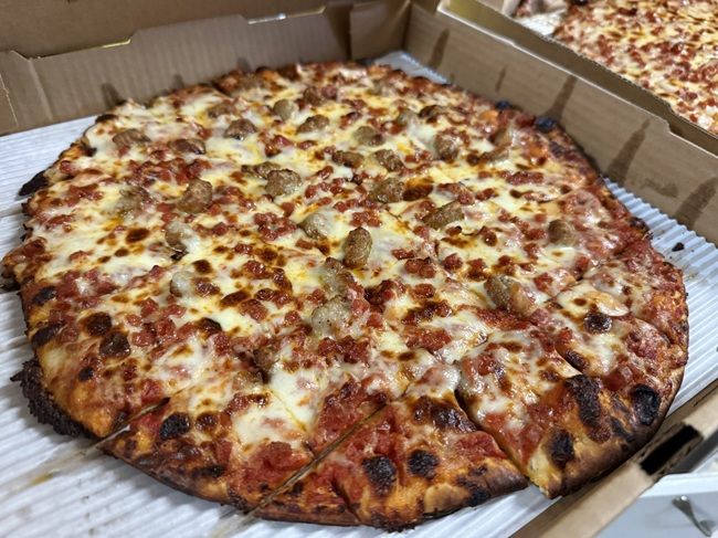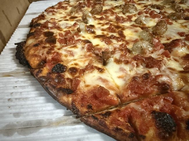 The Otis Meat Lovers Pizza is topped with ham, pepperoni, sausage, and ground beef. The pizza pizza had sorts of crispy bits around the edges and from where some of the meats stood up.