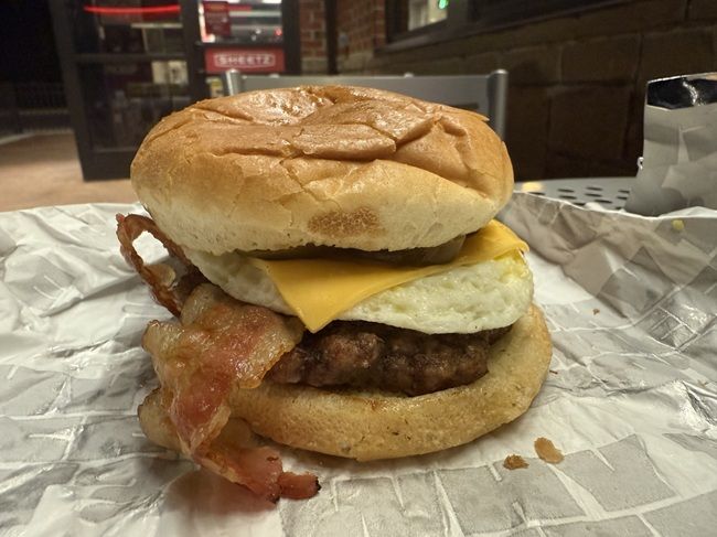 The next thing I got in to was the burger. I got my burger with a fried egg, American cheese and bacon. No sauces because I was in the car. This burger is way better than most gas station burgers because it’s made fresh. It doesn’t have time for the bun to get hard. I was actually really surprised by how good this burger was. It’s still a gas station cheeseburger but the freshness really helps. The fried egg is cooked all the way through and the bacon is actually somewhat crispy. I feel like I’ve had burgers at Sheetz before and they haven’t been as good as this one. The fact that I was really hungry probably has something to do with it.