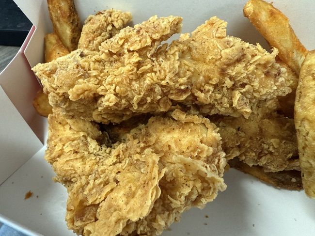 The chicken counter is incorporated into the cashier’s counter. It’s a small warming cabinet with the menu on TV screens hanging above it. The cashier also runs the chicken so I just went to him and asked for my usual of the four piece tender box. The clerk thought I said four piece chicken box and started filling that. I stopped him and changed it tenders but looking back, I almost wish I would have just let him go with chicken. It’s been a really long time since I’ve had the chicken from Krispy Krunchy because I’m usually in the car and it’s easier to eat tenders. The cost for just the chicken and potato wedges was right around $11.