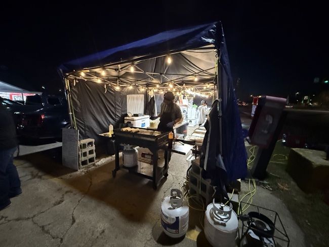 Cantu’s Cocina can’t quite be called a “food truck” but they are a mobile food operation who has set up a semi permanent business in the parking lot of Sweet Convenience. They use a couple of pop up tents and have them tied together with blue tarp walls. Their whole operation is mobile with cooking taking place on a Blackstone and the rest of the food being kept warm in slow cookers on tables behind the cook.