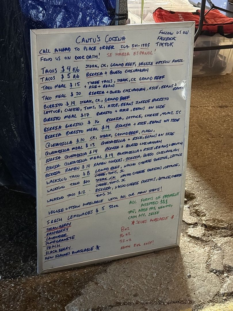 The pop up Mexican joint was pretty busy on this Friday night. The parking lot was overflowing at the Convenience store. I headed inside first to grab a couple of Pepsi’s then headed back out to the tent to look over the menu that is written on a dry erase board sitting on the ground next to one of the poles. It’s a little tough to read at night but I saw what I was looking for right away.