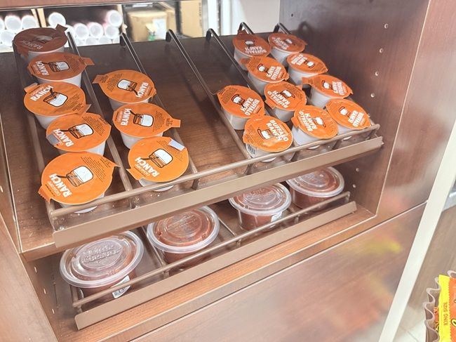 There is a display off to the right of the pizza warming boxes with cups of marinara sauce and ranch if you’re grabbing something that needs a dip.