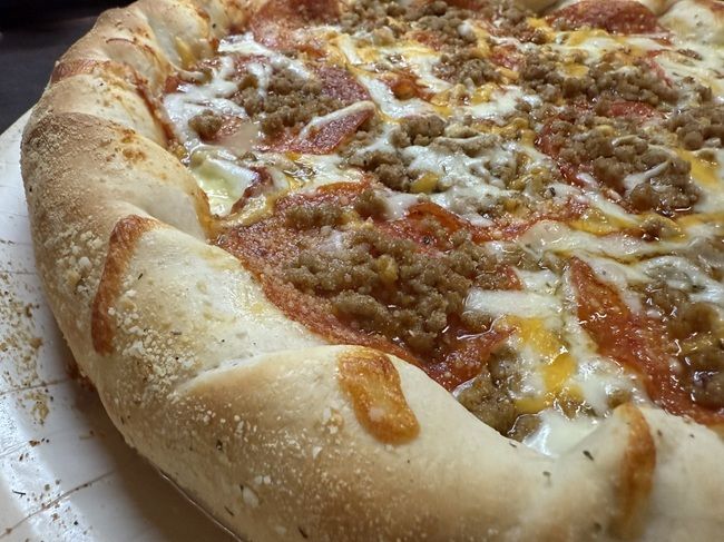The crust was filled with mozzarella sticks and the pizza was topped with large pepperoni’s and mounds of Italian sausage. The crust flavor really dominated this pizza. The crust has a very fresh, homemade taste to it. It actually reminded me a lot of something like a D’Girono but much, much better. It’s a very chewy crust..especially with the cheese rolled in to the handles. I got some garlic butter to dip it in plus I used some of the garlic dipping sauce left over from our Cottage Inn order.