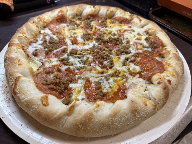 I put in an order in online for a 14″ Cheesy Garlic Stuffed Pizza with sausage and pepperoni. The cost was right around $20. I put the order in before I left for Grand Rapids so it would be ready when I got there.