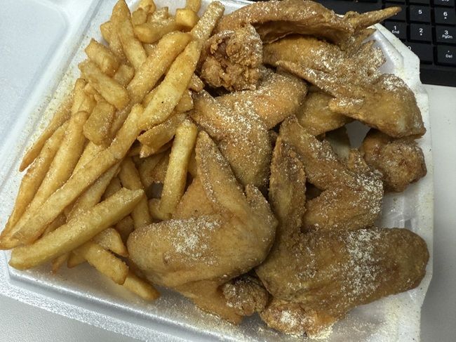 I got the box of food almost exactly 15 minutes after I ordered. It was so full the cashier couldn’t even close the box. I told her it was fine. She shook on some of the same lemon pepper seasoning I get on the chicken at the Shell station then she grabbed me a can of Orange Faygo and I headed back to the office to eat.