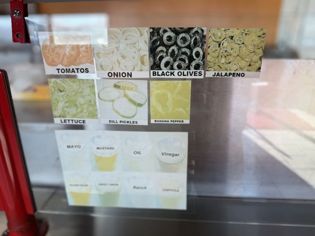 The layout of the shop is like pretty much any other sub shop. There’s a counter at the back of the shop where meats and cheeses are cut fresh in front of you and a small topping station between the meat slicer and the cash register. The simple menu is hanging on a wooden sign on the back wall.