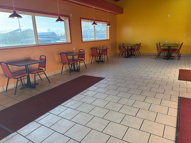 There’s a fairly large dining room but there aren’t a lot of tables. The cheap restaurant style tables and chairs sit on a white tile floor up against a bright yellow wall with red accents. There’s only about a half dozen tables in a space that could probably hold three times that many.