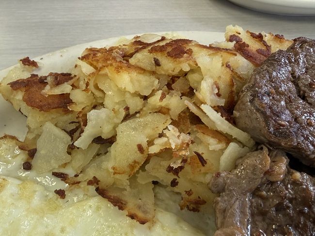 The plate also came with choice of potatoes or grits. I chose the hash browns. The top half of these has browns were amazingly good. They were super crispy and had that crunch on the top with the softness underneath. Most of the stack of potatoes under that top layer though were all soft and a little under done. That didn’t stop me from eating them though. I polished off the whole plate plus a couple triangles of toast that came with it (and a few of J’s fries in that A1 sauce).