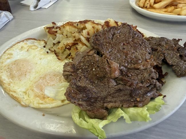 I was the only one who did breakfast because I saw the Two Eggs and 6 oz. Steak on the menu. This plate is a classic steak and eggs. I got the eggs over medium and the steak medium. The steak is not a great cut of meat but that’s what I like from diner’s. They also had a NY Strip option on the menu but it was a lot more expensive. I love the cheap, kind of tough, salty steaks diners use for steak and eggs. It looks like the kind of steak you want to slather in sauce to make it edible but there’s is such a good flavor from the seasoning and the crispy bits from the griddle.