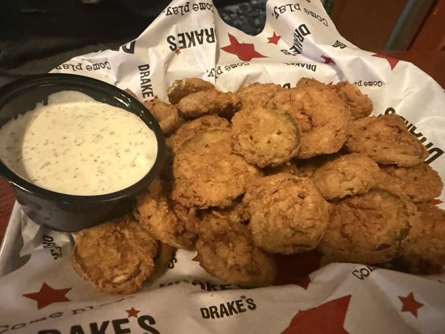 J wasn’t super hungry because we stopped at Wally’s in Pontiac for lunch. She got a pulled pork sandwich there and some chips so she wasn’t in the mood for a full dinner. Instead, she ordered the Drake’s Fried Pickles. She was excited about this because the order is pickle chips, not spears. The pickles are hand breaded and deep fried then served with “ambrosia ranch.” Even the small order was too much for her to finish on her own.
