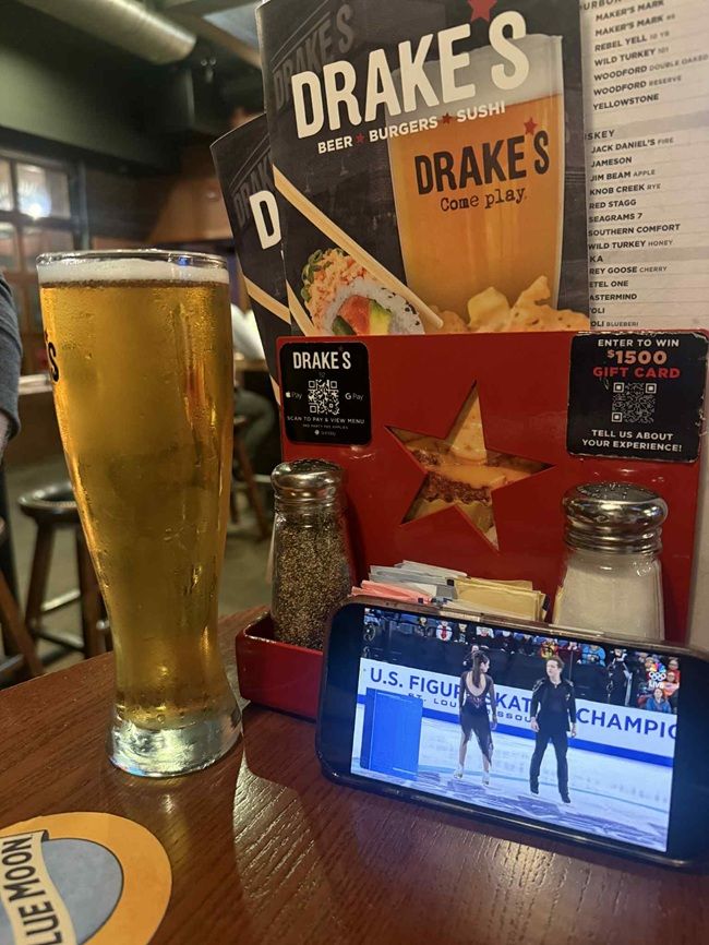 We were in a sports bar but none of the TV’s were on the sport we wanted to watch. The CFP game between Miami and Ole Miss was about to start so we didn’t ask to change a TV. I figured that would not have been a popular decision to ask for a TV to be changed from the college football play off to figure skating so we just propped my phone up on the table and we all kind of gathered around to watch the final rhythm dance group while waiting for our food.