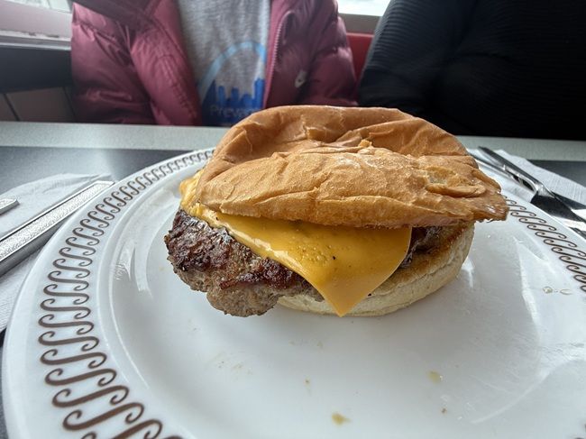 B ordered a cheeseburger. That was all he wanted. No hash browns. No bacon. No waffles. Just a cheeseburger. Like J’s grilled cheese, it was a little sad looking cheeseburger. It actually had a really nice crispy edge from the flat top but that threw him off. He kept asking why it was crunchy. He hasn’t come to appreciate the diner cheeseburger yet. He ate all but one bite, which is his MO, so the crunchy stuff couldn’t have bothered him too much.