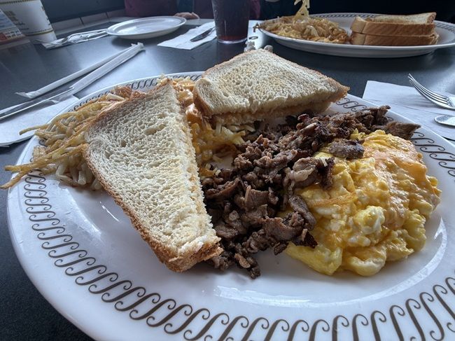 I ordered the Cheesesteak and Cheese Eggs breakfast. This plate is a classic breakfast plate with steak, eggs, potatoes and toast. The cheesesteak is something I actually really like at Waffle House and I’ve ordered it in sandwich form before. On this plate, the cheesesteak is just piled on the plate. I used the toast that came with the meal and put some of the meat and some of the cheese covered scramble eggs on to make a sandwich and it was just as delicious as I had hoped. In the future, I would probably go back to the Steak and Eggs or the Texas Cheesesteak Melt sandwich though as loose cheesesteak is kind of awkward to eat. It was super tasty though.