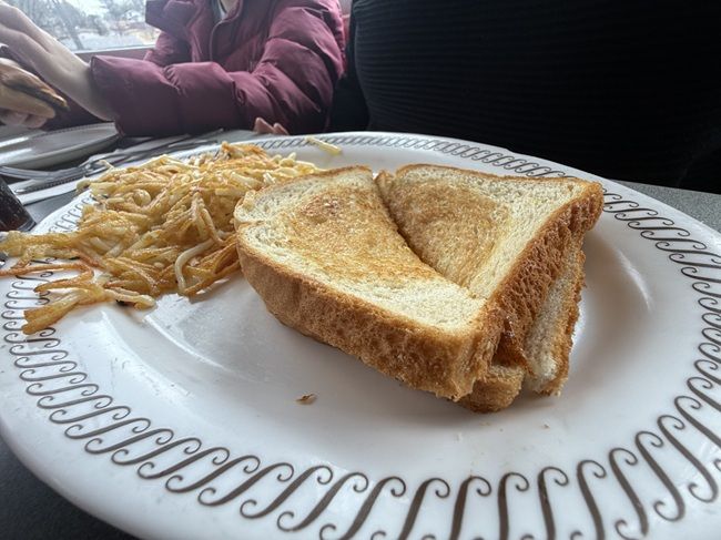 The hash brows at Waffle House are some of my favorite. I get them chunked (ham), covered (cheese), and peppered (jalapenos). There wasn’t really a lot of any of the toppings but hash browns themselves were perfect. Nice and golden brown on top and cooked all the way though. There was enough cheese that I could get some in almost every bite but there was a lack of jalapenos and ham so those bites were a little more sparse.