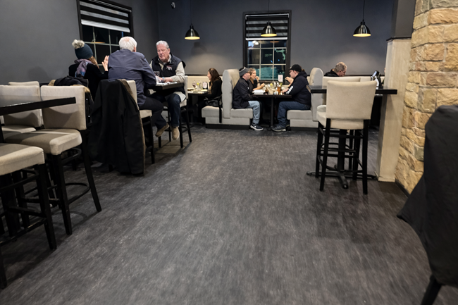 There is a dining room on either side of the bar area. Both are kind of closed off from the bar to give the place a more intimate feel. There is a mixture of pub tables and booths throughout the space all with a higher quality furniture than you expect at a pub. The decor is kept pretty muted with grey walls, a grey tile floor, and black furniture. The focal point of the space is a block fireplace used to separate one of the dining rooms from the bar.