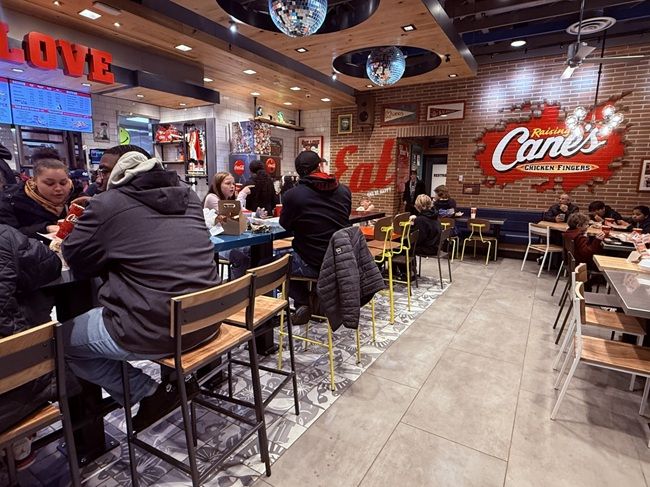 It shouldn’t be a surprise that this Raising Cane’s looks like every other Raising Cane’s. The decor is simple. Faux brick wall with the Cane’s logo busting through. There are some disco balls for some reason and the floor is large pieces of tile. There’s one big communal table in the middle of the restaurant and several smaller tables along the perimeter. Obviously, the places was full on the first weekend open but it was overcrowded as I walked in to order.
