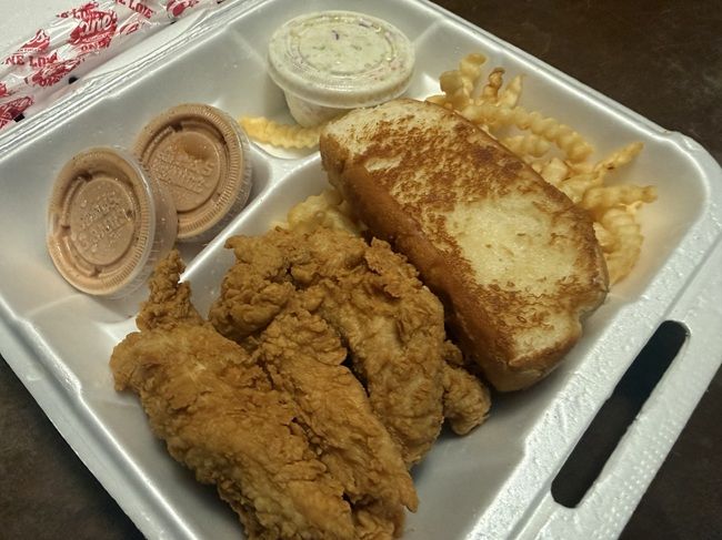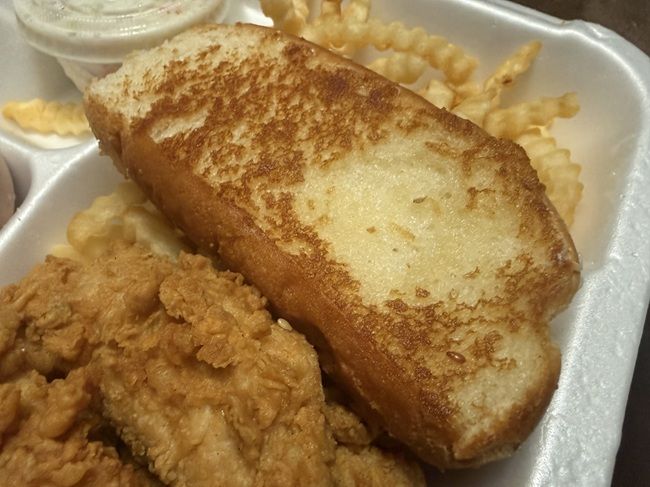 I popped the box open when I got home and handed my toast to L. That’s the thing she loves about Cane’s. I’ve seen copycat recipes where this is a Japanese Milk Bread but I don’t know if that’s how Cane’s actually makes it. It’s a really soft, pillowy bread with good toast marks around the edges. L doesn’t really like Chicken Fingers so when we stop at Cane’s, we usually just order her a couple extra pieces of bread.