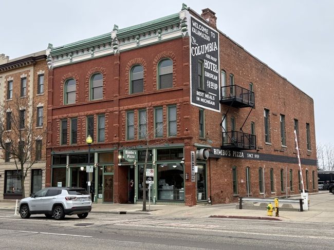 That pizza is Bimbo’s Pizza on East Michigan Avenue east of South Pitcher Street in downtown Kalamazoo. The pizza joint has been around since the late 1950’s in a large three story brick building that, until the 1980’s was the Columbia Hotel. The part of the building Bimbo’s is in actually started life in the late 1800’s at the Arlington Hotel. Eventually, that building along with the one next to it were absorbed in to the much large, half a block wide building that would become the Columbia Hotel. Bimbo’s location in the northwest corner of the building appears to have always been some sort of restaurant. Before it was Bimbo’s Pizza, it was Paris Cafe. Bimbo’s opened in this location in 1959 and almost 65 yeas later, it’s still ran by the same family.
