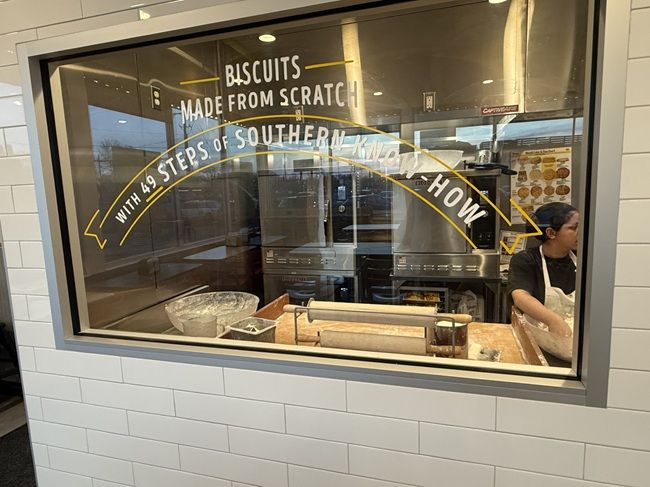 I ordered two biscuits because biscuits are kind of a thing at Bojangles. They’re made from scratch in house. There’s a little window that looks in to the kitchen where you can watch the biscuits being made. An employee was just starting a fresh batch and I was sitting down to eat.