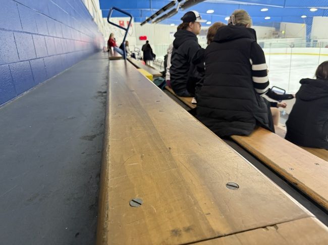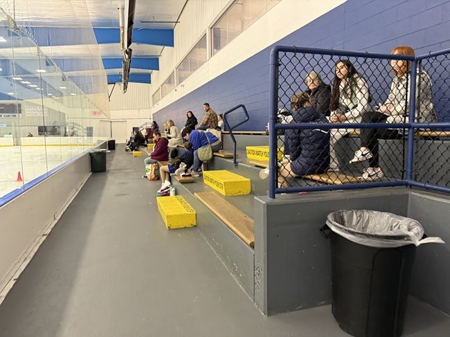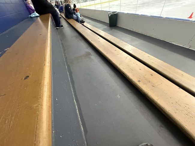 The seating is a concrete structure with wood benches laid on top. There are heaters above the seating section and they were turned on so it was pretty warm in the rink.