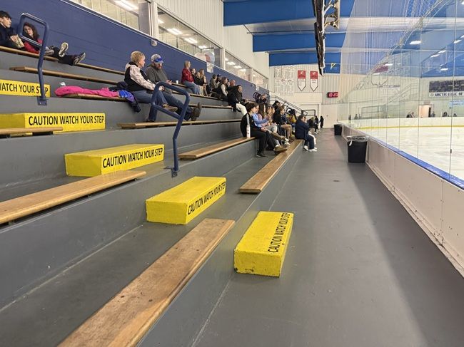 There is a small, three row seating section that runs the length of the ice on the side near the doors.