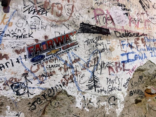 The main decor is graffiti on the walls. It looks like they, or someone prior, plastered over the brick walls. That’s now chipping and people have taken to writing their names on the peeling plaster.