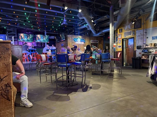 The main level is the bar and live music area. The stage is actually set up in front of the windows which can open up to the street. There was a classic rock cover band playing when we walked in which I think is part of the reason we picked it. Living on a Prayer was the song everyone was singing along too as we stepped through the door. We’re not nearly as big of country music fans as we were last time we went to Nashville. I’ve hit the “new country sucks” age. To be fair, I don’t hate all of it….I just started to fade out during the Bro-Country era.