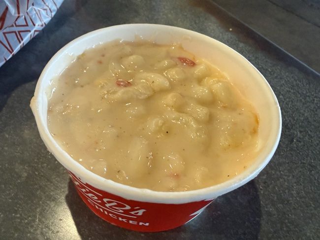 The Pimento Mac and Cheese is an interesting flavor combination. The macaroni noodles were swimming in a thick sharp cheddar cheese sauce that included red pimentos. I know pimento is kind of a southern flavor and it was tasty but I don’t think I’d want to eat too much of it. J ate about half of the cup but I don’t know if she was just not hungry or didn’t like it. I will say I’m glad I didn’t get it for the kids because I know they wouldn’t have liked it.