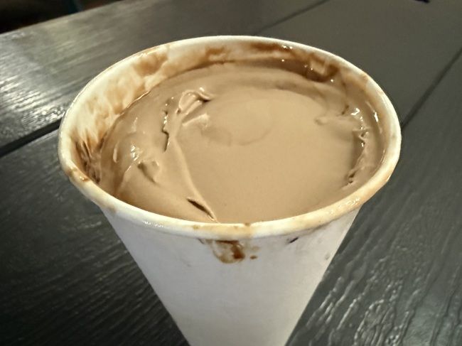There is a little covered area off to the side of the building with a couple of picnic tables. That’s where everyone was waiting. There’s a speaker system where they call out your name when your ice cream is ready. The don’t wait for everything to be ready at the same time so B got his ice cream before I got mine.